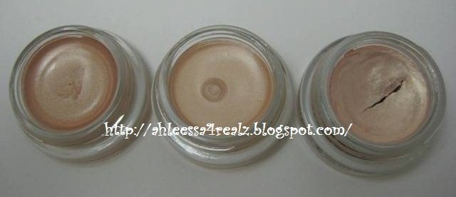 Thankfully, I own all three. :X The one on the left is Maybelline in Barely Beige, middle is Maybelline in Barely Branded, and the right is MAC in Bare Study. It's kind of hard to tell from the picture. They look the same, but a little different. I have to say Barely Branded (metal one) is more on the beige compared to the rest. I think MAC in Bare Study has the most shimmer and is on the pink side.
